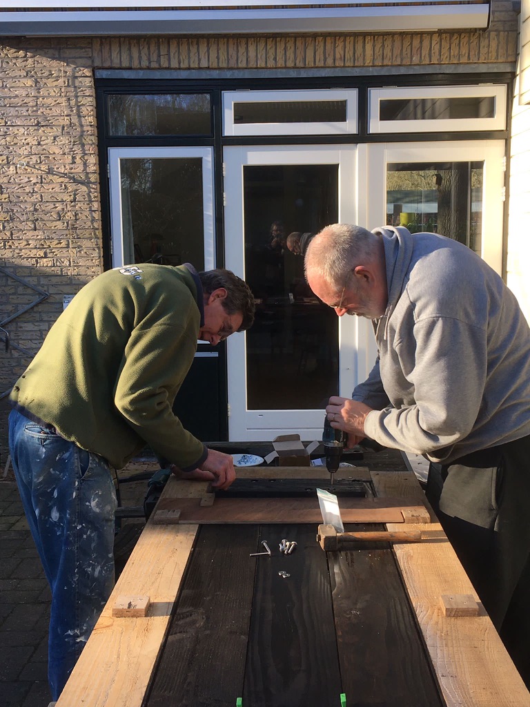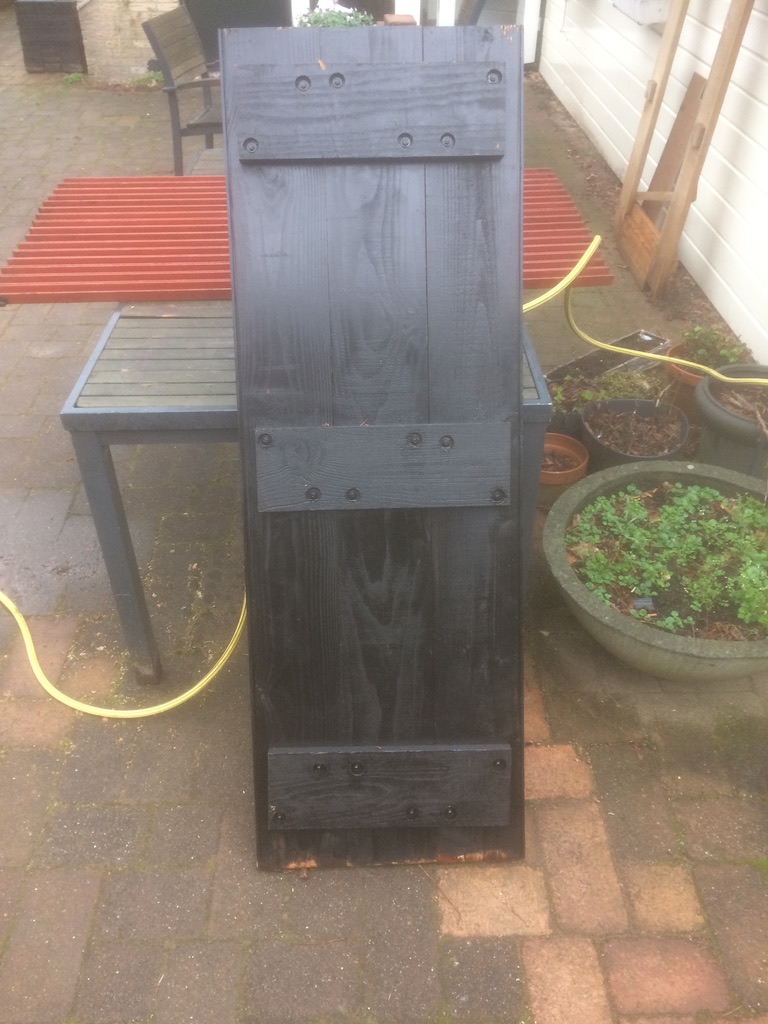 Thuis wordt al dat hout eerst opgeslagen naast het huis. Dan, met de afkortzaag van buurman Jaap, alle lengtes op 1,57 afzagen, in een verstek dat gelijk is aan de helling van de kap (12 graden), zodat de kopse kanten straks verticaal staan. Met hulp van Louis en Laus worden alle 136 planken in de Tenco Houtcoat Zwart gezet, net als de 138 eiken klampen die de planken tot luiken moeten maken. De stapels planken sorteren op buiten links, midden en buiten rechts (=buiten links, maar hoge en lage uiteinde verwisseld, dus omgedraaid). En dan kan de montage beginnen!