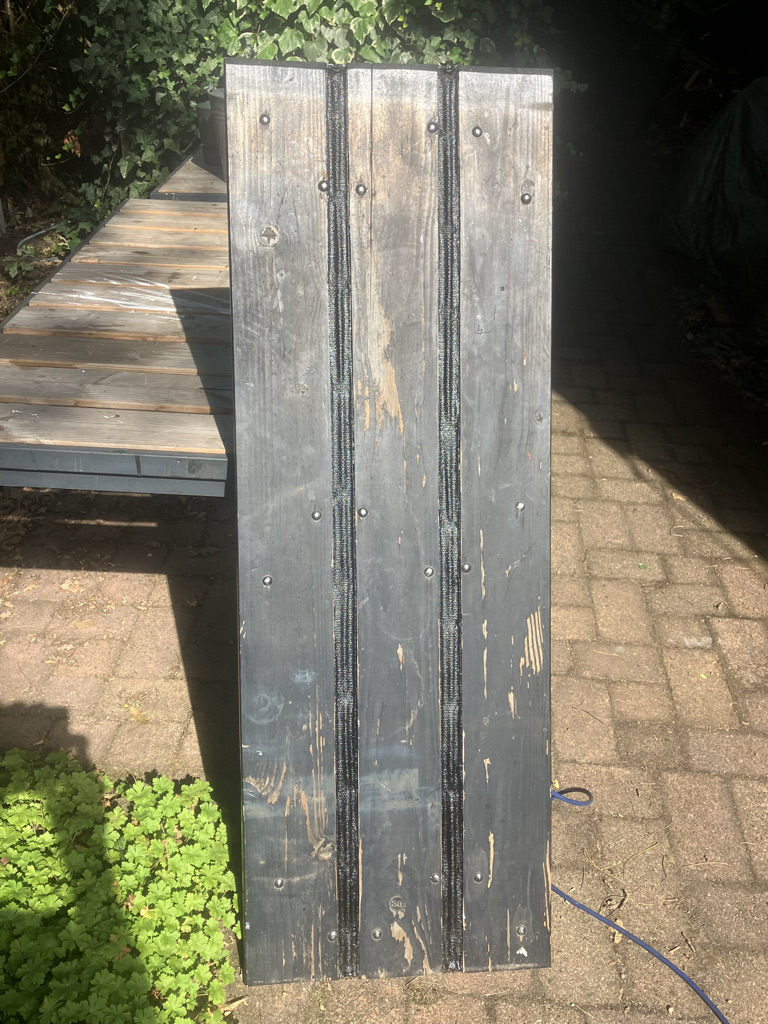 Onder onze luiken komt geen dure kaas te liggen en waterdicht hoeven ze ook niet te zijn: er zit immers een stalen kap vlak onder. Zwart hoeven mijn presennings dus alleen voor het oog te zijn. Daarom meende ik slim te zijn en de presenningband met textielverf zwart te verven. Dat was om twee redenen een verkeerde gedachte… In de eerste plaats kromp dat presenningband, ruim op maat afgeknipt, in de wasmachine tijdens het verven enorm; ik heb ze er behoorlijk op spanning op moeten zetten, anders had ik ze allemaal kunnen weggooien. Maar ten tweede bleek die textielverf het daglicht niet te kunnen velen; al heel snel verbleekte de geverfde presenningband naar een stemmig lichtgrijs.