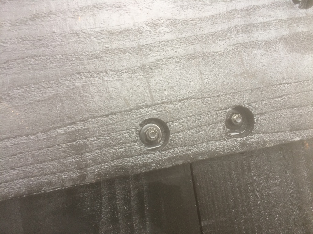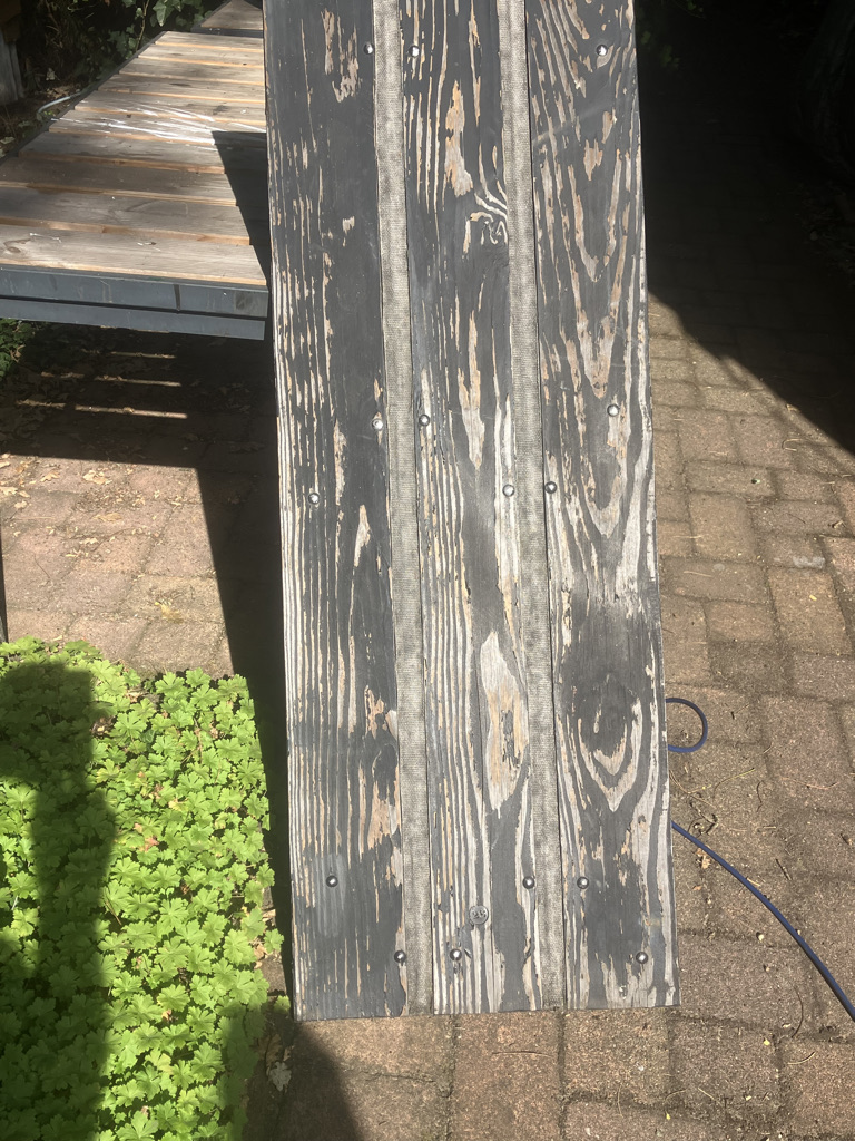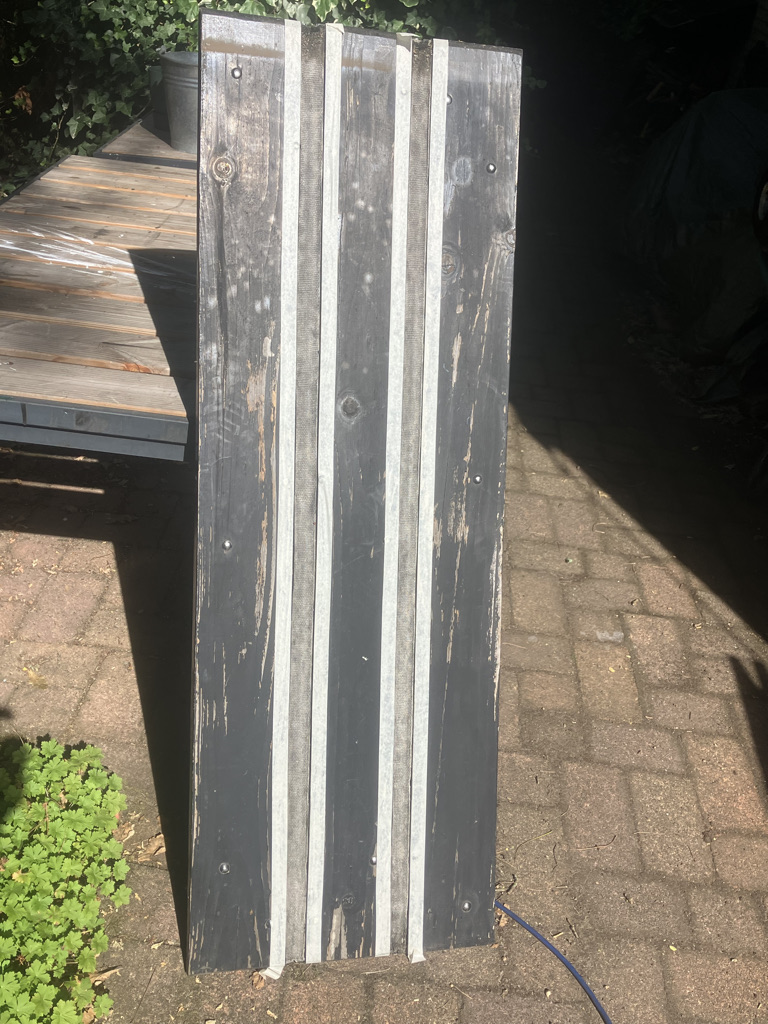 De bifluoridebehandeling van mijn Douglas Aquawood maakt dat ik na twee jaar nog geen spoortje van aantasting heb gezien. Maar het lijkt wel een beetje ‘uit te zweten’ en de hechting van de houtcoat is iets minder goed dan op onbehandeld hout. Dat betekent dat mijn luikenkap nu wel een touch up nodig had. Daarbij had ik kennis gemaakt met een soort vloeibare rubber (Bison Rubber Seal) dat heel mooi zwart opdroogt en, hoewel het wat dof wordt, goed kleur houdt en flexibel blijft. Het is goed overschilderbaar, heel goed spleetvullend, waterdicht en bevat geen oplosmiddelen (waterbasis). Dus op elk luik de presennings afplakken, twee keer met Rubber Seal insmeren, dan de planken grof schuren en nog eens in de houtcoat zetten. Nu ziet de luikenkap er weer goed uit.