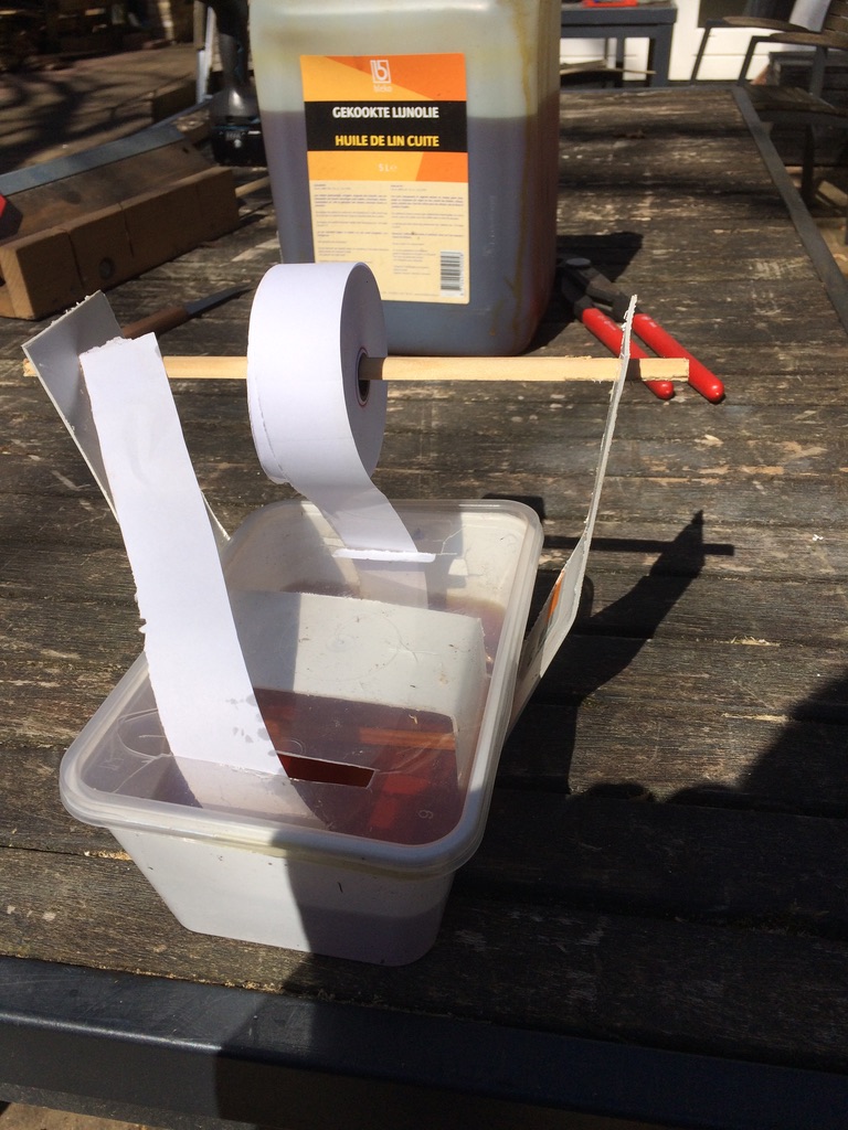 En dan denk je dat je een heel eind bent, maar hoe zat dat ook weer met die presennings? De naden tussen de planken moeten met presenningband waterdicht worden gemaakt. Dat deden ze vroeger met teer, maar dat mag nu niet meer. En omdat teer zacht wordt door de warmte, moest er onder die presenningband een strook geolied papier, zodat er geen teerdruppels op de lading konden komen. Dus kocht ik bij de Makro wat rolletjes gewoon papier voor de kassa, zaagde die doormidden en had toen precies 30 mm breed papier. Met een oud diepvriesbakje improviseerde ik een olieinrichting, waarin de strook papier van de rol door de lijnolie werd geleid en dan op de juiste lengte kon worden afgeknipt.