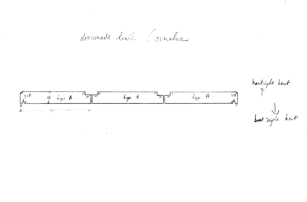 Bij 44 luiken en twee pasluiken heb ik 88 + 4 = 92 buitenplanken nodig, bij 3 per lengte van 5 m dus 31 lengtes. In de 44 luiken zitten 44 middenplanken, bij 3 per lengte dus 15 lengtes. Bij elkaar is dat 46 lengtes oftewel 39,1 m2. Eén extra lengte, ongefreesd, als reservemateriaal naast de ene buitenplank en de ene middenplank die ik overhoud (als ik niets verknoei!) is geen overbodige luxe. 47 Lengtes van 5 m, gezaagd en eenzijdig geschaafd, dat kan de Friese Fijnhouthandel leveren. Ze doet er ook nog voldoende op de goede maat gezaagd eiken bij, voor de klampen. De profielen frezen kan bij Van der Werf in Bolsward, maar daar neemt mijn houtleverancier geen verantwoordelijkheid voor. (Dat had een waarschuwing moeten zijn… Als ik later aan het verwerken ga, blijkt dat die houtbewerkers in Boalsert ofwel niet weten wat de hart-zijde van een plank is ofwel niet opletten wat ze aan het doen zijn: een aantal lengtes (dus drie keer zoveel planken) is aan de verkeerde kant gefreesd. Maar ja, daarover in discussie gaan? Mijn vader was ook een Fries…)